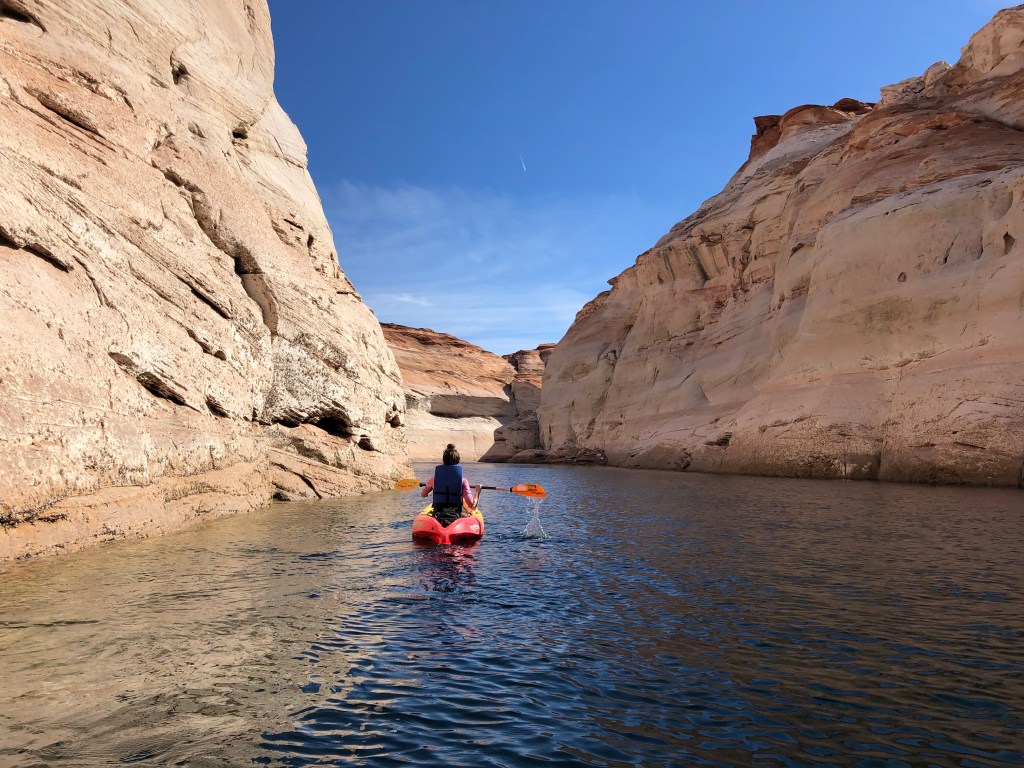 Upon arrival to Page, we rented kayaks. We dropped the kayaks in at a boat launch in Lake Powell at Glen Canyon National Recreation Area. Lake Powell is actually part of the Colorado River. Strapping the kayaks in our rental truck, we cruised through the deserted roads and once we reached the boat launch, we noticed that the sun was shining and the river was glistening, inviting us to dip our paddles into the water. Sunglasses perched onto our noses, bathing suits donned, and snacks stowed in our waterproof bags, we set off on our journey.